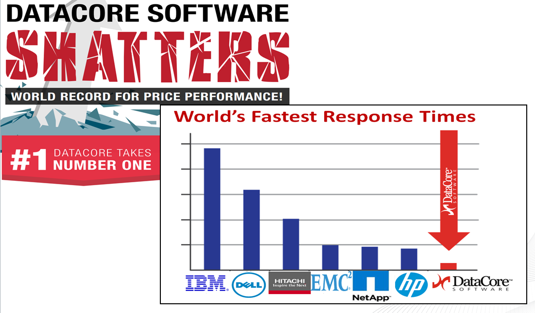 Como ponto de referência, DataCore utilizou um sistema hiperconvergente disponível nas lojas com foco em aplicações OLTP de classe empresarial e dados sensíveis a latência para 459,290.87 SPC-1 IOPS™, com um custo total de hardware, software e três anos de apoio ao preço de 38,400.29$ dólares, colocando o SPC-1 Price-Performance™ no principal resultado de 0,08 dólares por SPC- 1 IOPS ™. Esta é uma melhoria de 300% em relação ao recorde anterior de 0,24$ por SPC-1 IOPS™2 oferecido pela Infortrend EonStor DS 3024B e menos de um 25% do custo da linha top de armazenamento, incluindo EMC EMC VNX80003, toda a gama NetApp EF5604, armazenamento Dell SC40205 e HP 3PAR StoreServ 74006.